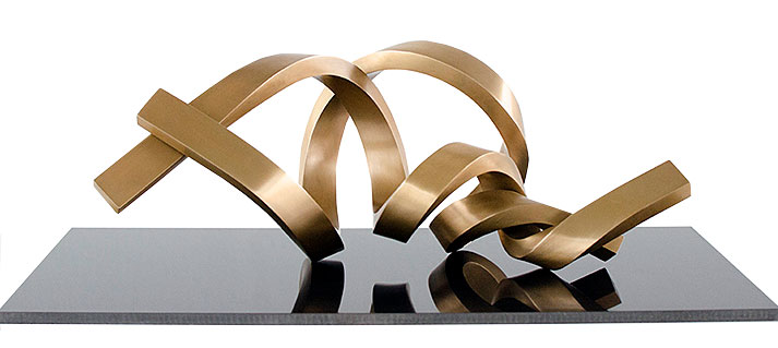 De sammanflätade spiralerna utstrålar kraftfull elegans och erbjuder ett brett spektrum av möjliga associationer.skulptur i borstad brons. På svart, polerad granitbas. Begränsad upplaga om 10 exemplar, numrerad och signerad. Skulpturens storlek 25 x 49 x 20 cm (H/W/D). Vikt ca 8 kg. Granitsockel storlek 3 x 25 x 20 cm (h/w/d). Vikt ca 4 kg.