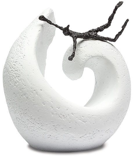 Dynamisk skulptur med stort tolkningsutrymme från serien "Business and Motivation" med en mycket imponerande kontrast mellan den mörka patinerade bronsen och den ljusa gjutna stenbasen. Levereras med expertis. Storlek 14 x 13 x 8 cm (h/b/d). Vikt 1,2 kg.