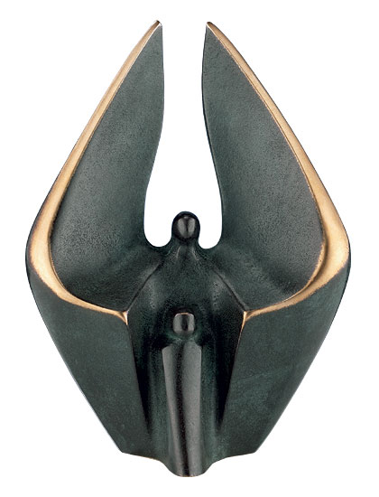 Smakfull och enkel men ändå elegant bronsfigur med smala vingar. Själva änglafiguren har en mörkgrön, nästan svart patina som står i stark kontrast till vingarnas polerade kanter. Bronsfiguren är gjuten i ett traditionellt bronsgjuteri i Niederrhein, patinerad och färdigställd för hand. Storlek 13 x 17 x 5 cm (B/H/D).