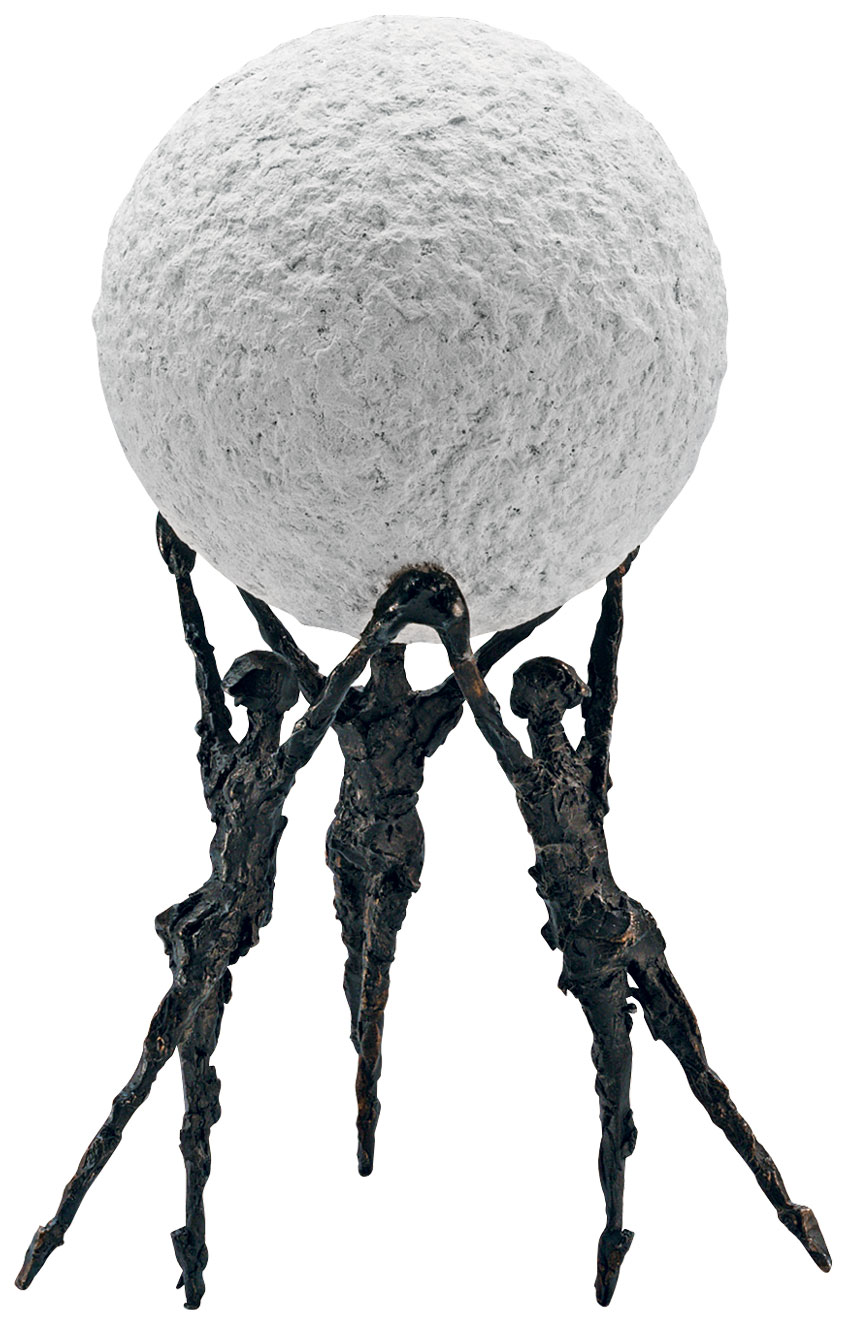 Från serien "Business and Motivation": I ett team växer individen bortom sig själv. I samklang flyttas stora saker med lätthet. Liten skulptur i mörk patinerad brons och ljus gjuten sten. Höjd 19 cm.