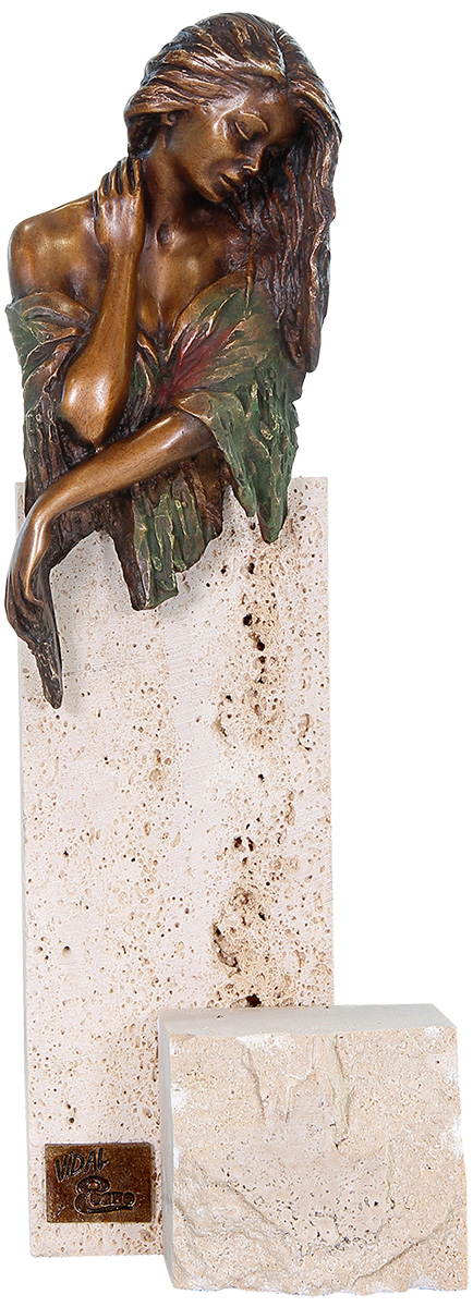 De graciösa bronsfigurerna av den spanske skulptören Vidal kännetecknas av elegans och grace. Här i en effektfull kombination av patinerad brons och en bas av travertinmarmor, kalcedon och turmalin. Begränsad upplaga om 2.999 exemplar, numrerad och signerad. Storlek 41 x 13 x 10 cm (h/w/d). Vikt 3,9 kg.
