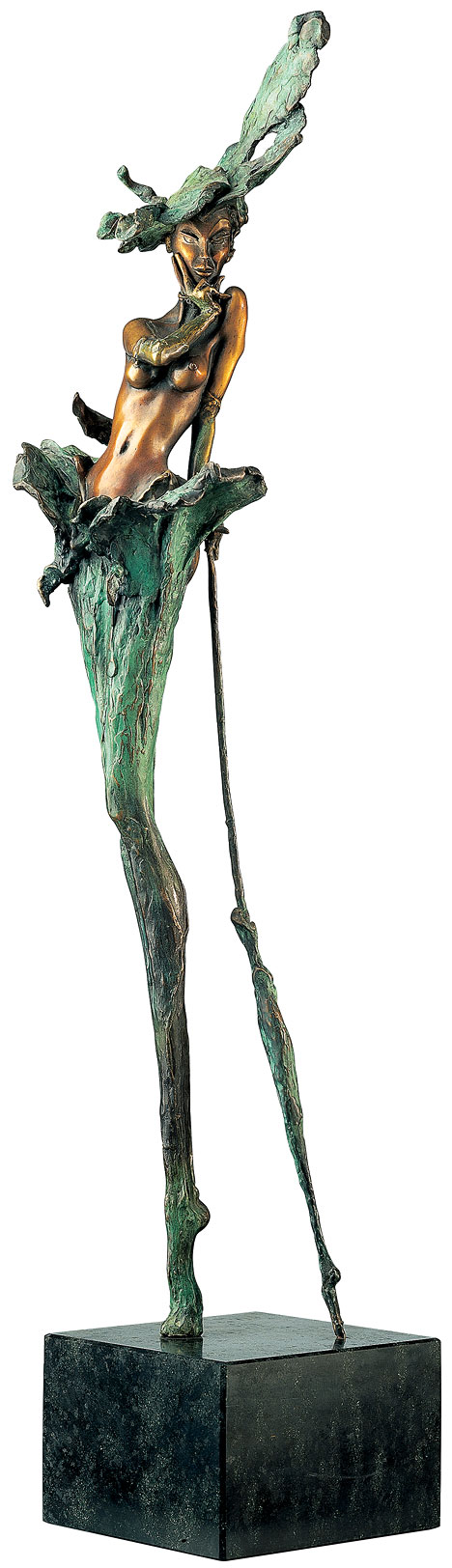 Med sina graciösa bronsskulpturer frammanar den holländske konstnären Marc van Megen en värld där fantasi och idealism anger tonen, långt borta från vardagslivets realiteter. Konstnären kallade sin skapelse "When the lady smiles", en kvinnokropp med slank elegans som växer ut ur en blomkalv, en dröm om en hatt på huvudet. Skulptur i brons. Begränsad världsupplaga på endast 99 exemplar. Gjuten med hjälp av tekniken för förlorat vax. Finpolerad, tvåfärgad patina, numrerad och signerad, med gjuteriets stämpel. Monterad på svart marmorsockel 15 x 15 x 10 cm. Höjd inkl. sockel 80 cm. Vikt 10 kg.