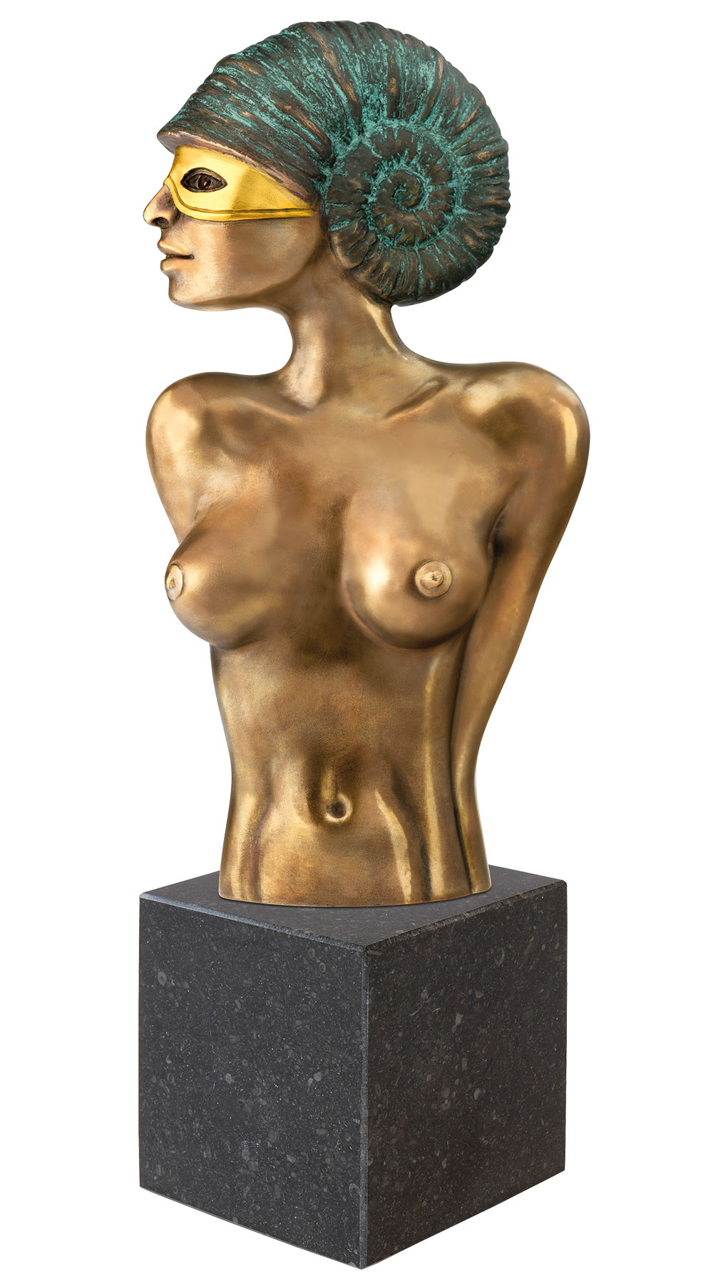 I Beckers skulpturala avbildningar av sina ammoniter är det harmoniska samspelet mellan den symmetriska skalformen och den kvinnliga kroppens naturliga skönhet särskilt slående. Edition i fin brons. Gjuten med tekniken för förlorat vax, flerfärgad patina. Med 24 karats bladguld på masken. Begränsad upplaga om 49 exemplar, numrerad och signerad. Format inkl. bas av skalkalksten 30 x 11 x 8 cm (h/w/d). Vikt ca 3,3 kg.