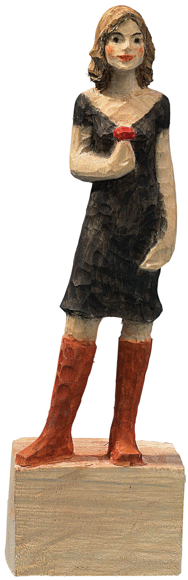 Michael Pickl skapar skulpturer av helt moderna män och kvinnor, så som vi kan möta dem på gatan varje dag, och porträtterar dem i stunder av avkoppling och lycka. Inget trä är för krokigt för att konstnären inte ska kunna skapa en människa, en mycket modern sådan. Hans "fru" är modemedveten i en liten svart klänning och långa stövlar och håller en klarröd ros i sin hand. Polymergjutning med träfinish, delvis målad för hand. Begränsad upplaga om 299 exemplar, signerad och numrerad. Storlek 9 x 29,5 x 7,5 cm (B/H/D), vikt ca 900 g.