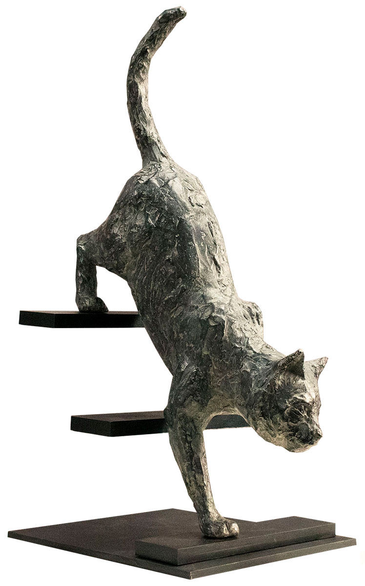 Miguel Guía har på ett känsligt sätt fångat och format ögonblicket då katten målmedvetet går ner för trappan med blicken fast riktad framåt.skulptur i handpatinerad brons. Begränsad upplaga om 199 exemplar, numrerad och signerad. Inkluderar numrerat certifikat. Totalmått 38 x 16 x 22 cm (H/W/D). Totalvikt ca 6,1 kg.