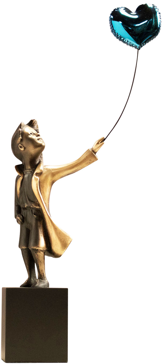 Pojken håller nonchalant den svävande ballongen med handen i fickan. I bra belysning kastar skulpturen en skugga på väggen, liknande graffiti. Ballong med blå metallic lackfinish. Begränsad upplaga om 299 exemplar, numrerad och signerad. Inkluderar numrerat certifikat. Storlek 34 x 16 x 7 cm (H/W/D). Vikt ca 1,3 kg.