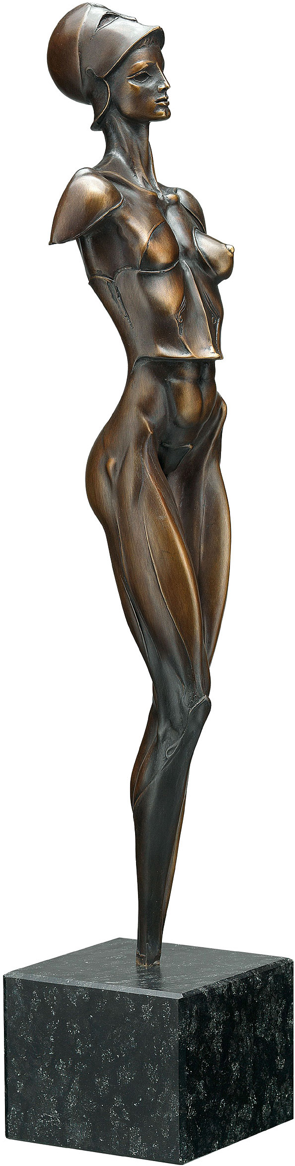 Nikolay Anev var särskilt passionerad när det gällde att tolka motiven i den klassiska grekisk-thrakiska mytologin. I detta verk har han ägnat sig åt det legendariska folket amasonerna, som enligt den homeriska Iliaden stred under sin drottning Penthesilea i det trojanska kriget. Anev visar sin amason som en figur bepansrad med hjälm och bröstplåt, pendlande mellan skönhet och styrka, elegans och orörbarhet. Exklusivt på ars mundi: skulptur i fin brons, gjuten med tekniken för förlorat vax. Handpatinerad, polerad och monterad på en bas av diabas. Begränsad upplaga om 199 exemplar, numrerad och signerad. Höjd inkl. sockel 54 cm. Vikt 5,5 kg.