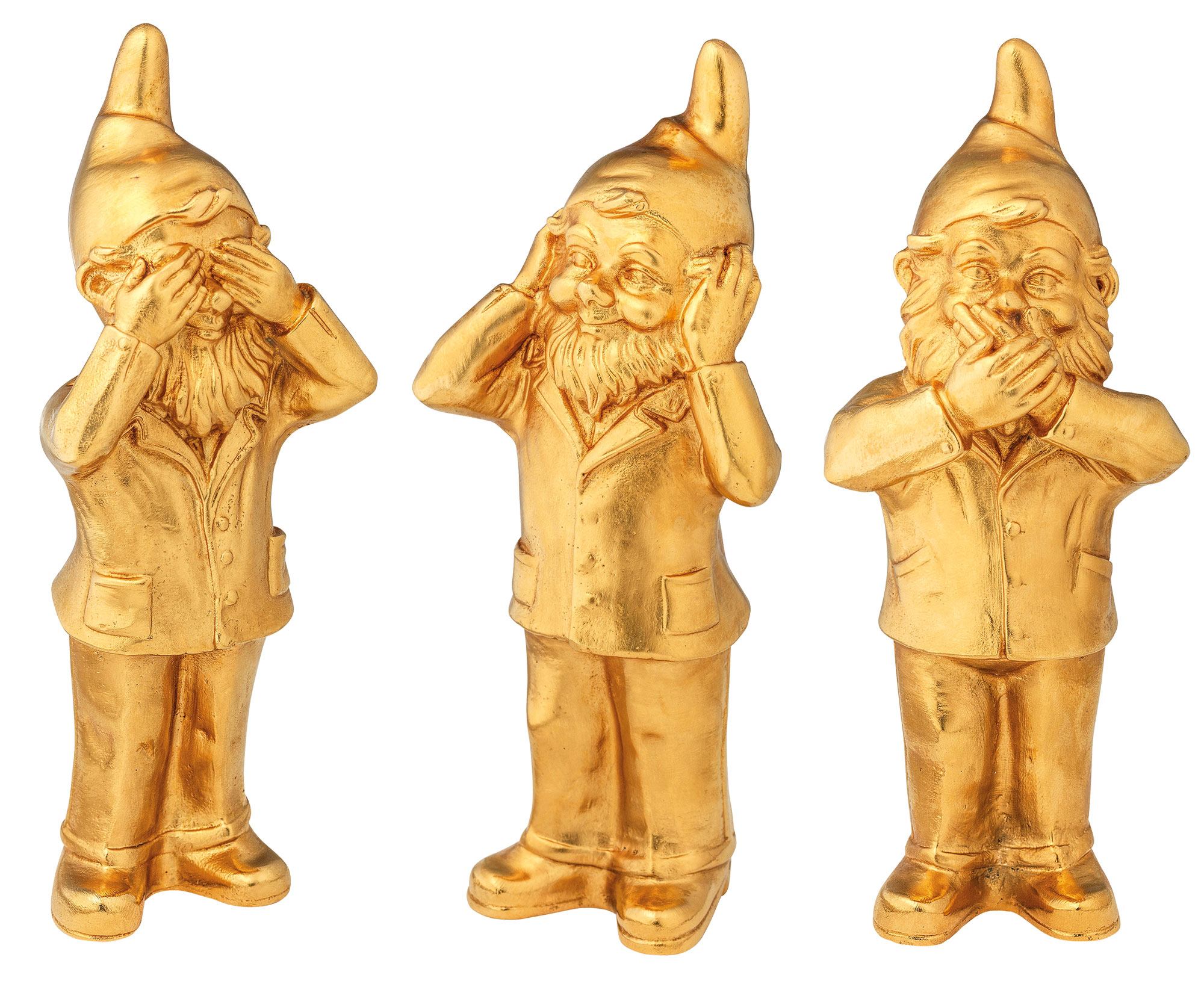1.200 dvärgar i färgerna svart - rött - gult och de tre attityderna "ser ingenting - hör ingenting - säger ingenting" var specialdesignade för konstmässan art Karlsruhe 2006. Prof Hörl talade om en "mild provokation", särskilt i lagens stad, och hans dvärgparad, byggd på en enorm träkonstruktion i en rektangel, kommer säkert att ha fått folk att le. Den "relativt politiska idén" (Hörl), som kan tolkas av varje betraktare efter eget gottfinnande, är ett bevis på en konst som söker konfrontation och inte vill gömma sig i ett museums skyddade atmosfär. Se ingenting, hör ingenting och säg ingenting. Detta är vad dessa tre hemlighetsbärare tar till sitt hjärta. Fritt efter det medeltida ordspråket: "Audi, vide, tace, si tu vis vivere pace (Lyssna, se och var tyst om du vill leva i fred)". Den tyske samtidskonstnären Ottmar Hörl vet hur han ska tematisera och iscensätta denna vardagliga situation på sitt vanliga humoristiska sätt. Signerad specialutgåva om 980 exemplar i guldpläterad (24 karat) gjutmetall. Format vardera ca 16 x 7 x 4 cm (H/B/D). Vikt ca 1,3 kg. ars mundi exclusive edition. alla tre skulpturerna i ett set.