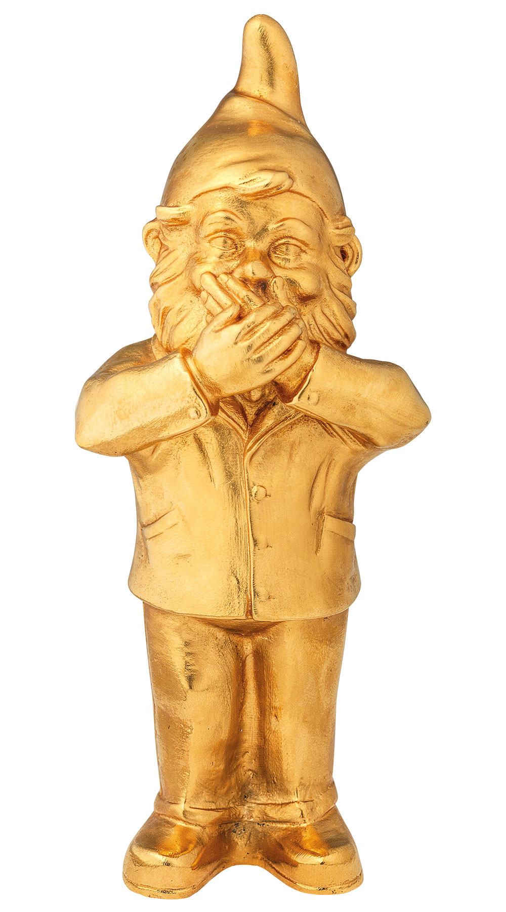 1.200 dvärgar i färgerna svart - rött - gult och de tre attityderna "ser ingenting - hör ingenting - säger ingenting" var specialdesignade för konstmässan art Karlsruhe 2006. Prof Hörl talade om en "mild provokation", särskilt i lagens stad, och hans dvärgparad, byggd på en enorm träkonstruktion i en rektangel, kommer säkert att ha fått folk att le. Den "relativt politiska idén" (Hörl), som kan tolkas av varje betraktare efter eget tycke och smak, är ett bevis på en konst som söker konfrontation och inte vill gömma sig i ett museums skyddade miljö. Signerad specialutgåva om 980 exemplar i guldpläterad (24 karat) gjutmetall. Format ca 16 x 7 x 4 cm (H/W/D). Vikt ca 1,3 kg. ars mundi exklusiv utgåva.