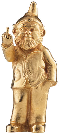 Dvärgar åtnjuter hans speciella tillgivenhet. De har gett koncept- och aktionskonstnären Ottmar Hörl uppmärksamhet och erkännande över gränserna. Med sina spektakulära storskaliga installationer i det offentliga rummet strävar professorn och den tidigare rektorn för konstakademin i Nürnberg efter att främja dialog och utforska spänningen mellan konst och natur. I Seligenstadt 1994 satte han till exempel upp tusen blå "Sponti-tomtar" - även kända som trädgårdstomtar med ett stinkande finger - individuellt och i gruppformationer i staden för sin installation "Fliegender Wechsel" (Flygande förändring) och lämnade dem åt sitt öde. Deras gradvisa försvinnande var önskvärt. För Ottmar Hörl var detta inte ett ägarbyte, utan fullbordandet av en förskjutning från det offentliga till det privata rummet, en positionsförändring i betydelsen "flygande byte". För övrigt kan inte modern tid skryta med att ha skapat gesten med det stinkande fingret. Den var känd redan i antikens Rom. ars mundi har tagit fram "Sponti Dwarf" i en numrerad och signerad exklusiv upplaga om 199 exemplar vardera. Tre versioner i gjuten metall, valfritt guldpläterad (24 karat), silverpläterad eller bronserad. Format vardera 7 x 15 x 5 cm (B/H/D). "Sponti dwarf", guldpläterad version. Vikt ca 1,3 kg.