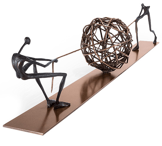 Komplexa problem kräver samarbete, precis som denna trassliga boll bara kan lösas med gemensamma krafter. Skulptur i brons, gjuten med tekniken för förlorat vax, mejslad och patinerad för hand. Begränsad upplaga om 49 exemplar, numrerad och signerad. Format 20 x 120 x 19 cm (H/W/D). Vikt ca 7,95 kg.