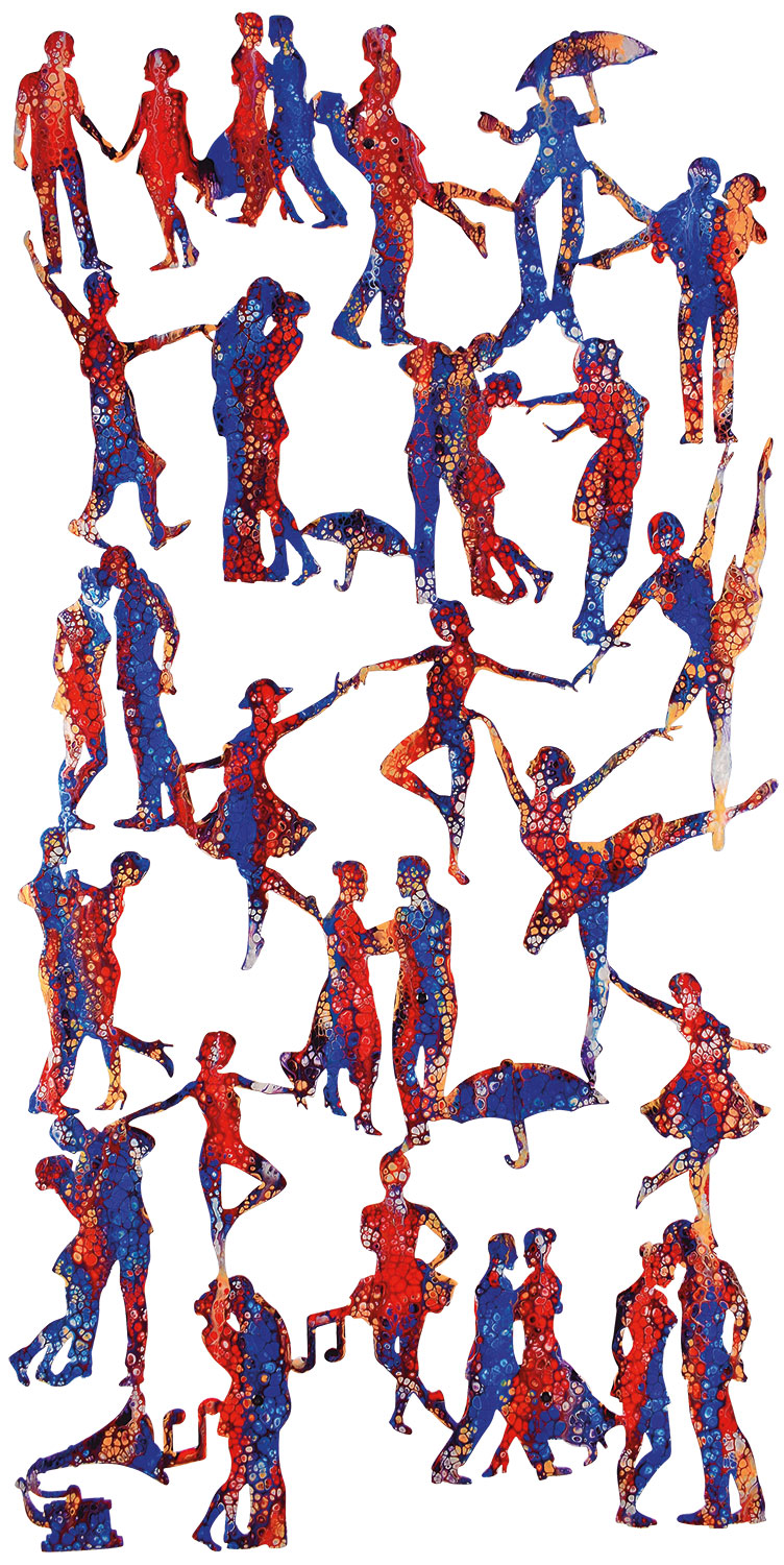 På väggskulpturerna är det bara motivens silhuetter som går att känna igen. Väggobjektens ytor visar inga ytterligare detaljer av motivet, utan är täckta av abstrakta, färgstarka och till synes slumpmässiga mönster av akrylfärg. Kontrasten mellan den definierade, figurativa silhuetten och det surrealistiska färghavet skapar en unik och spännande estetik. Den genomarbetade produktionsprocessen inleds alltid med handritade skisser. Utifrån dessa skärs motivets konturer ut i metallen med hjälp av en laser. Denna råvara grundmålas och målas sedan med akrylfärg. Slutligen kladdas färgen av med en läderduk och ytan värms kortvarigt upp med en låga för att skapa små ojämnheter och bubblor. Dessa bearbetningssteg gör att resultatet alltid är oförutsägbart och att varje objekt är unikt med en unik form och färgstruktur. Väggobjekt tillverkat av stål. Trettiosex figurer, laserskurna och handmålade, är sammanfogade till ett rytmiskt konstverk. Den expressiva färgsättningen understryker de dansande figurernas dynamiska rörelser. Storlek 117 x 58 x 2 cm (H/W/D). Vikt 3,9 kg.