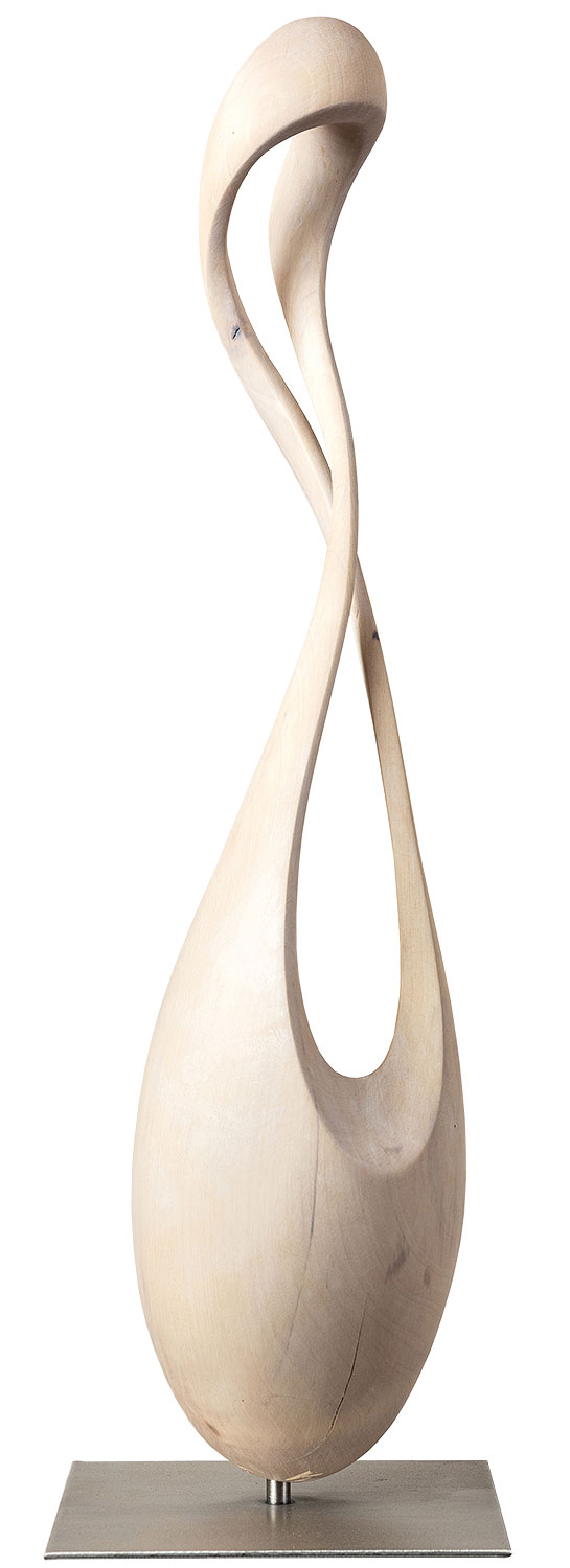 Skulptur av björkträ, skuren från ett block. Signerad. Uppställd på en stålplatta. Storlek 61 x 16 x 16 cm (H/W/D). Vikt 2,1 kg.
